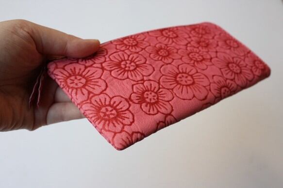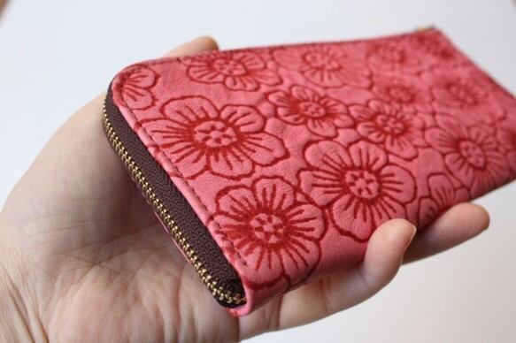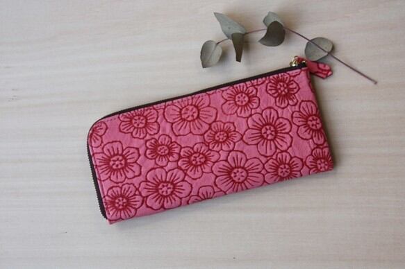 ピッグスキンのスリムな長財布L字型 フラワー チェリーピンク