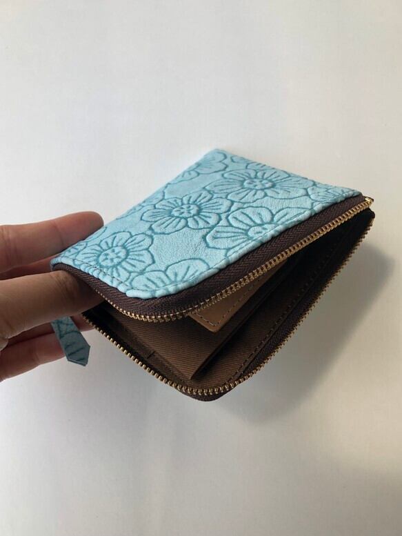 ピッグスキンのスリムなミニ財布 フラワー アクアブルー
