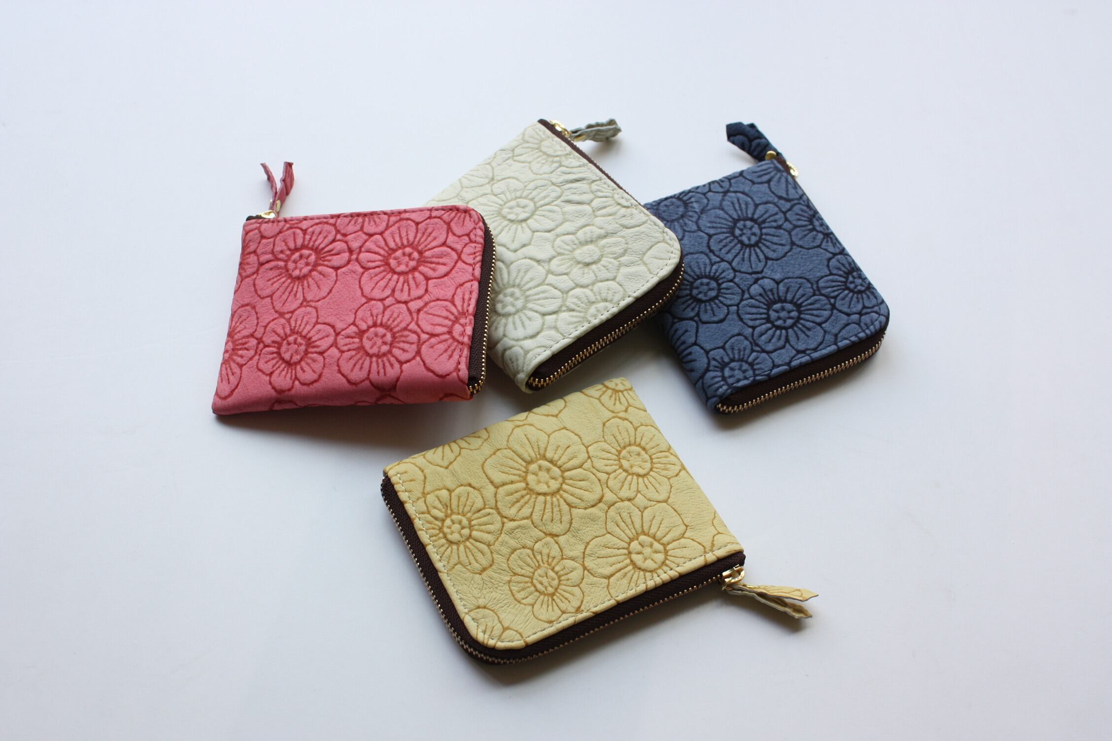 革におはなの模様を描いています。シボシボの革の質感が他にはない革です。革の手触りはふんわりしています。