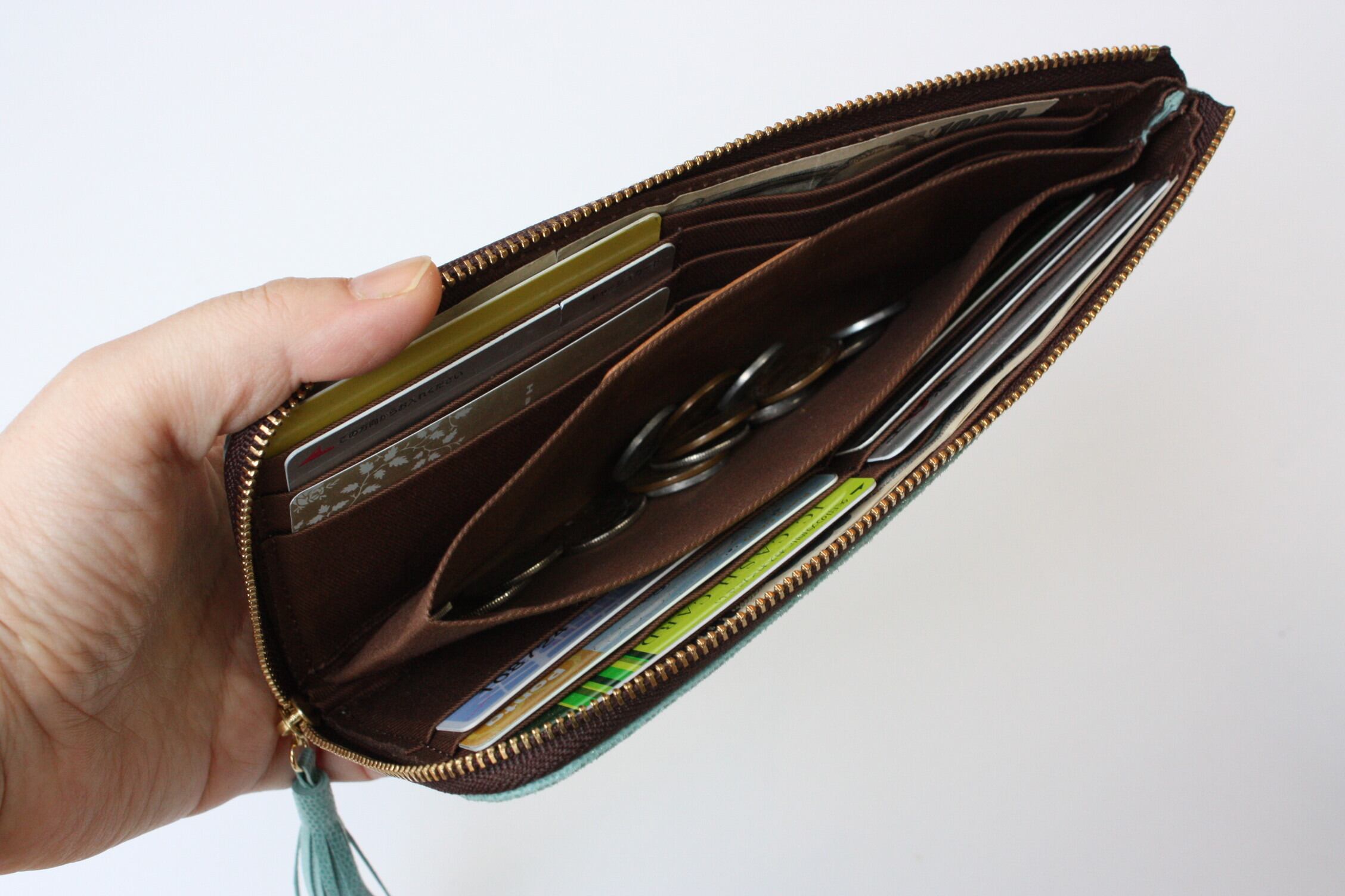 ファスナーを開けると、全体がよく見えます。お札もコインもとりだしやすいのに、スリムでカードもたくさん入るとっても便利な仕様になっています。