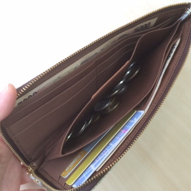 ファスナーを開けると、全体がよく見えます。お札もコインもとりだしやすいのに、スリムでカードもたくさん入るとっても便利な仕様になっています。